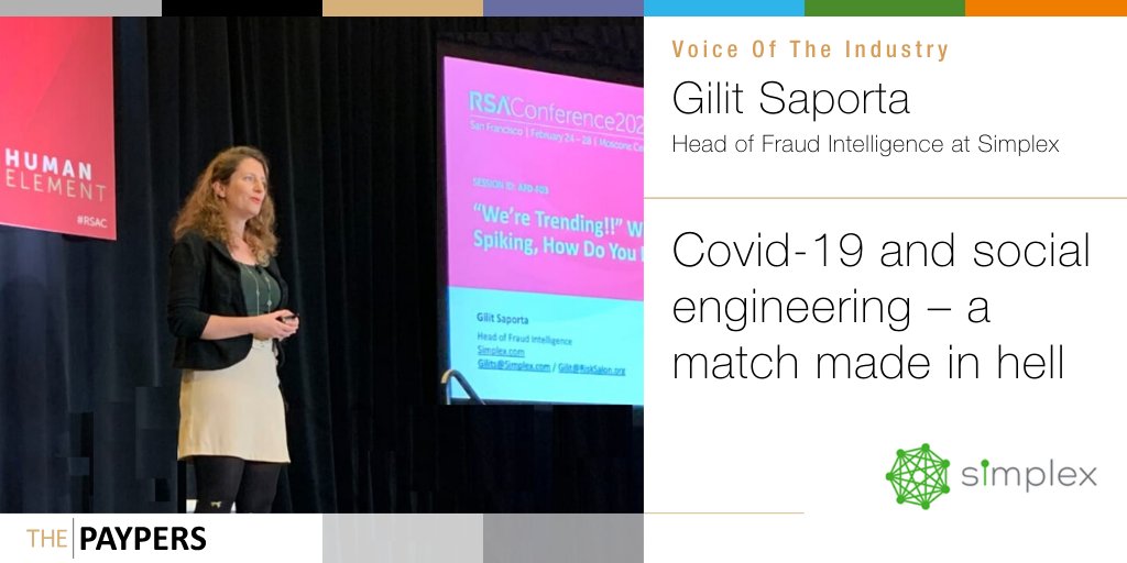 Gilit Saporta, Head of Fraud Intelligence at Simplex, addresses “work from home scams” and Covid-19’s influence on the growing number of phishing and social engineering scams Covid-19 and social engineering – a match made in hell Tuesday 31 March 2020 10:00 CET | Author Mirela Ciobanu | Voice of the industry Gilit Saporta, Head of Fraud Intelligence at Simplex,